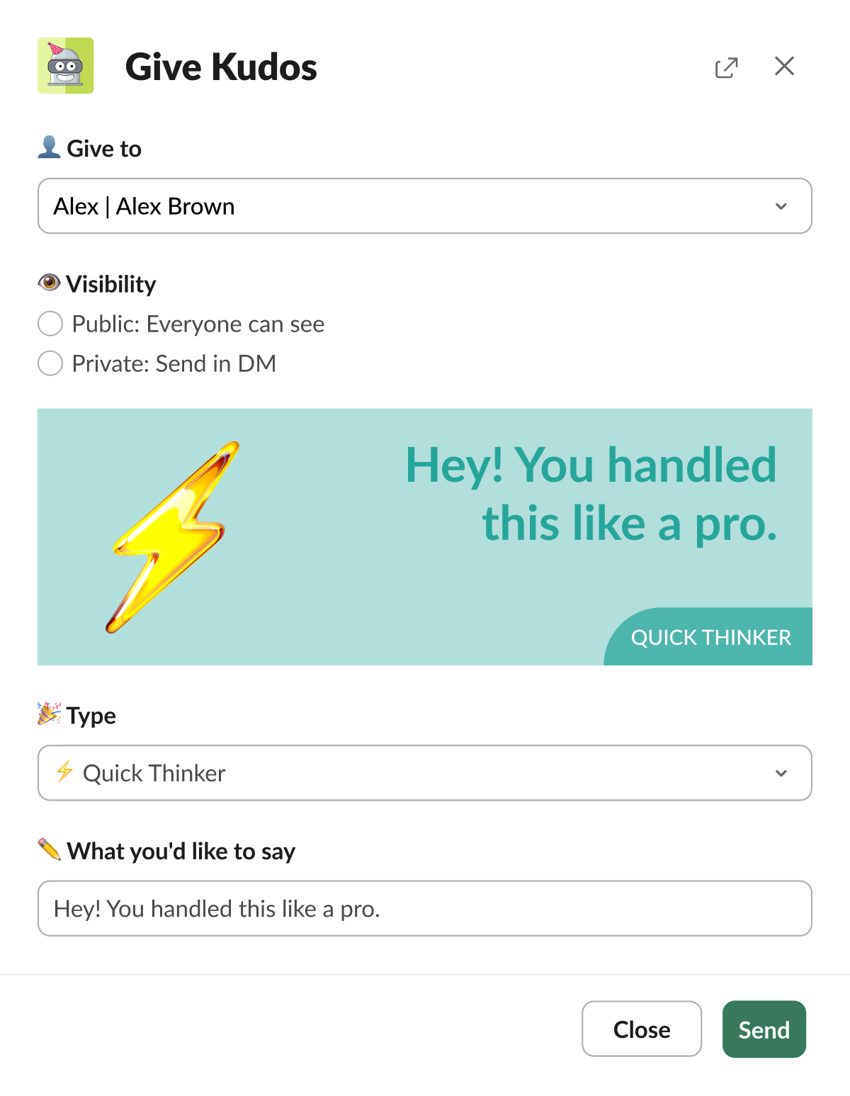 With Kudos, admins can schedule weekly and monthly reminders in Slack, while teammates can send shout-outs in a couple of clicks (publicly or privately), and everyone gets a personal collection of the kudos they’ve shared and received.